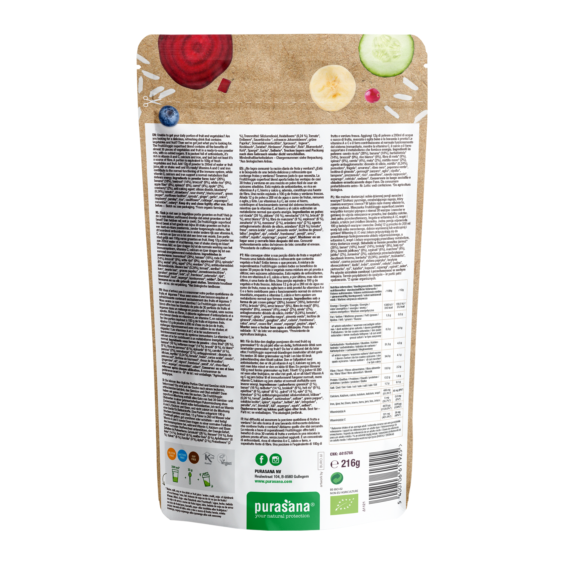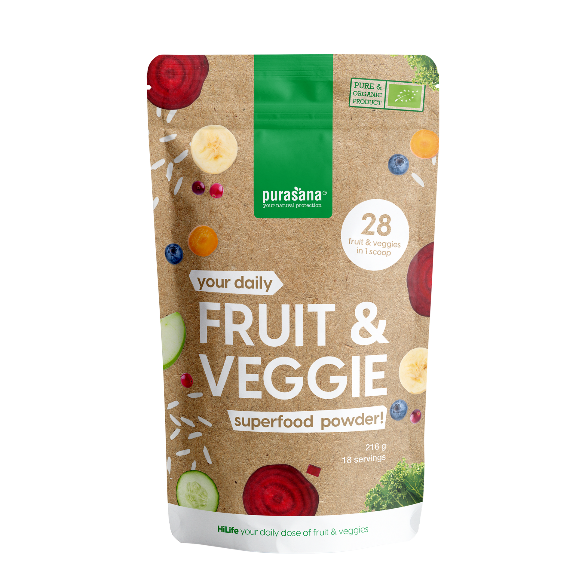 Purasana's Fruit&Veggie is a powerful superfood mix containing 28 types of vegetables and fruits. One serving corresponds to 5 pieces of vegetables and fruits, ideal for both young and old to ensure sufficient daily intake of nutrients.