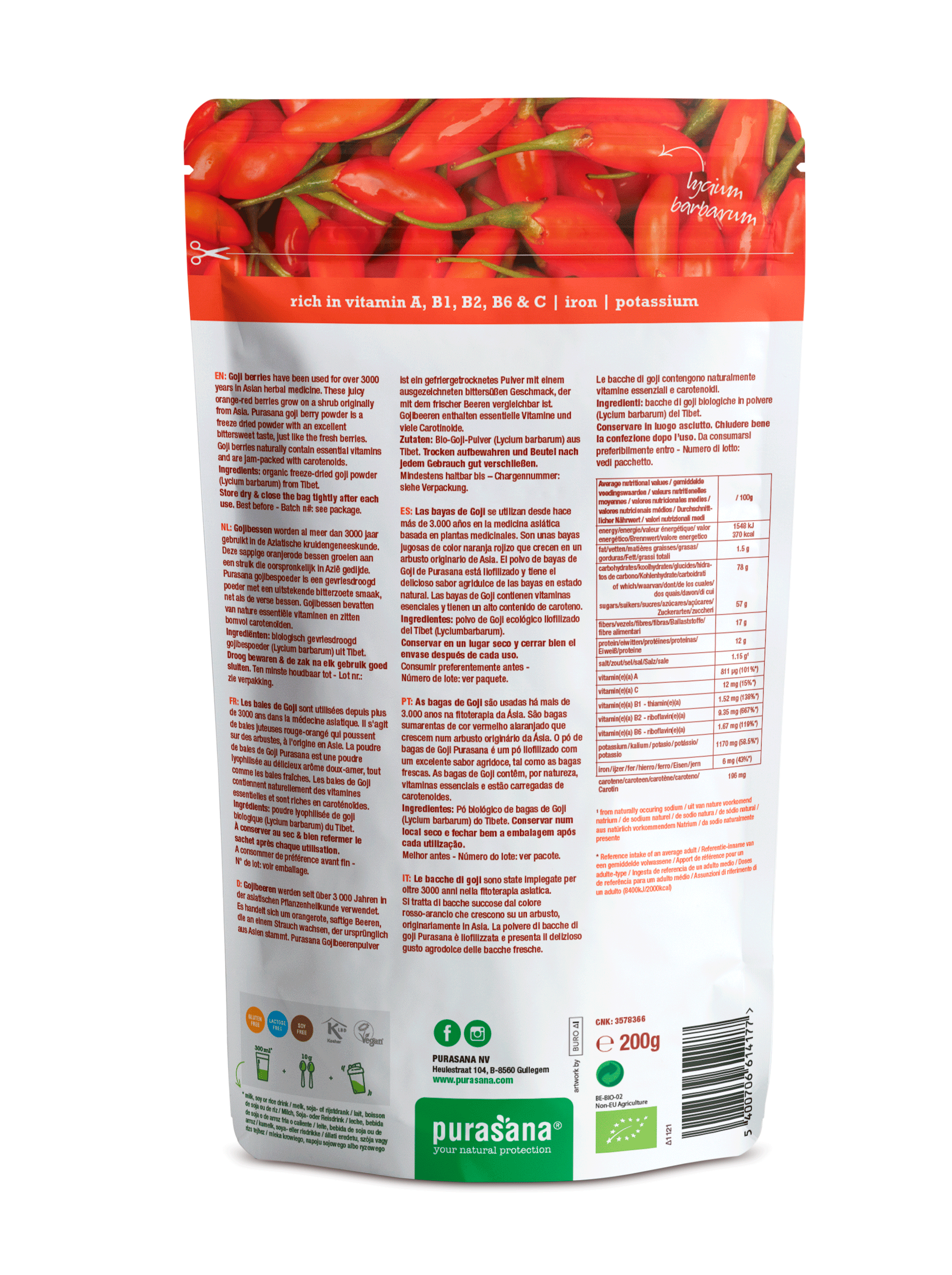 Goji berries have been used in Asian herbal medicine for over 3000 years. These juicy orange-red berries grow on a shrub that originally lived in Asia. Purasana Goji berry powder is a freeze-dried powder with an excellent bittersweet taste, just like the fresh berries. Goji berries naturally contain essential vitamins and are packed with carotenoids.