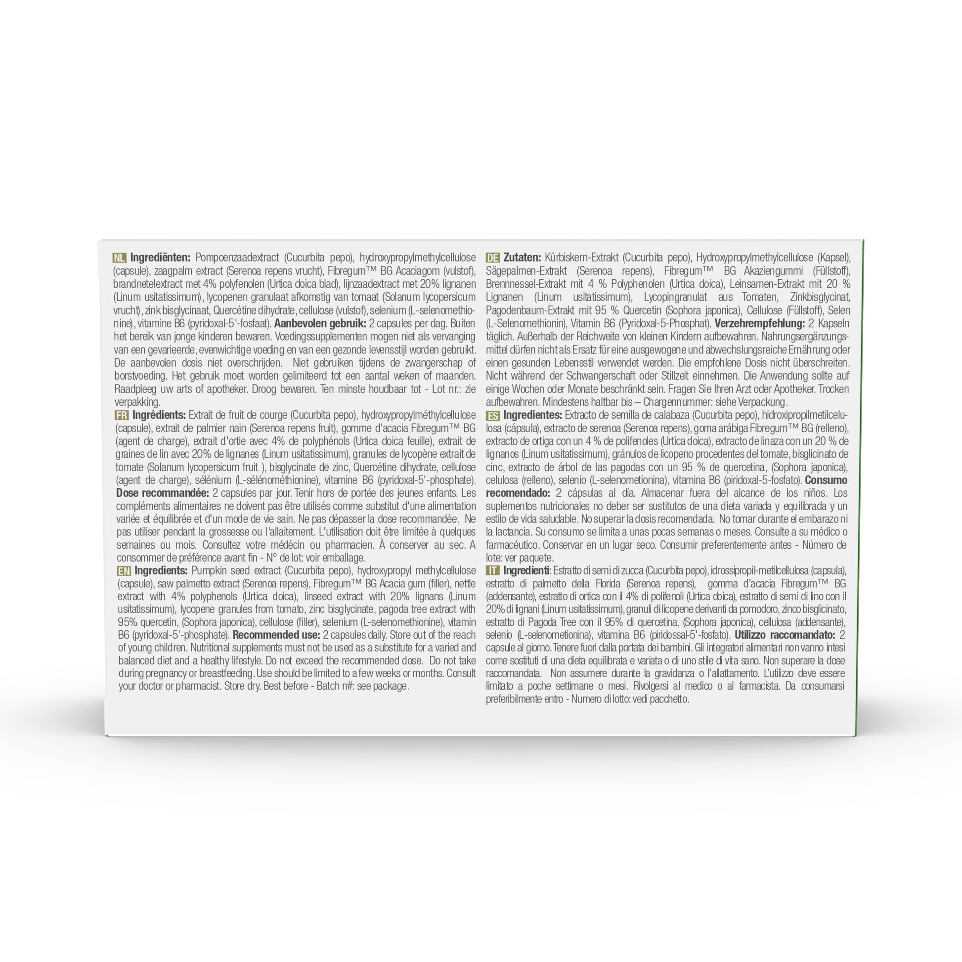 Pumpkin seed extract (Cucurbita pepo), hydroxypropyl methylcellulose (capsule), saw palmetto extract (Serenoa repens), Fibregum™ BG Acacia gum (filler), nettle extract with 4% polyphenols (Urtica doica), linseed extract with 20% lignans (Linum usitatissimum), lycopene granules from tomato, zinc bisglycinate, pagoda tree extract with